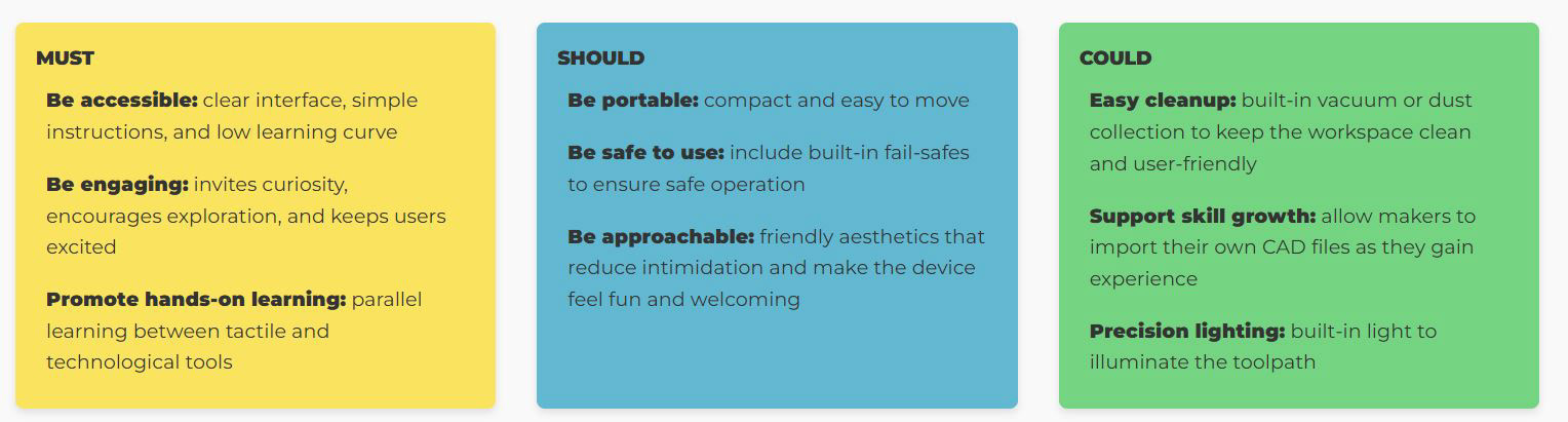 For beginners, the fabrication process can feel out of reach. The tools are often complex, the learning curve is steep, and the machines themselves are either expensive or are targeted for young audiences. Many tabletop CNC machines on the market lack essential safety features and clear, beginner-friendly guidance. All creating unnecessary barriers for those who simply want to start making.